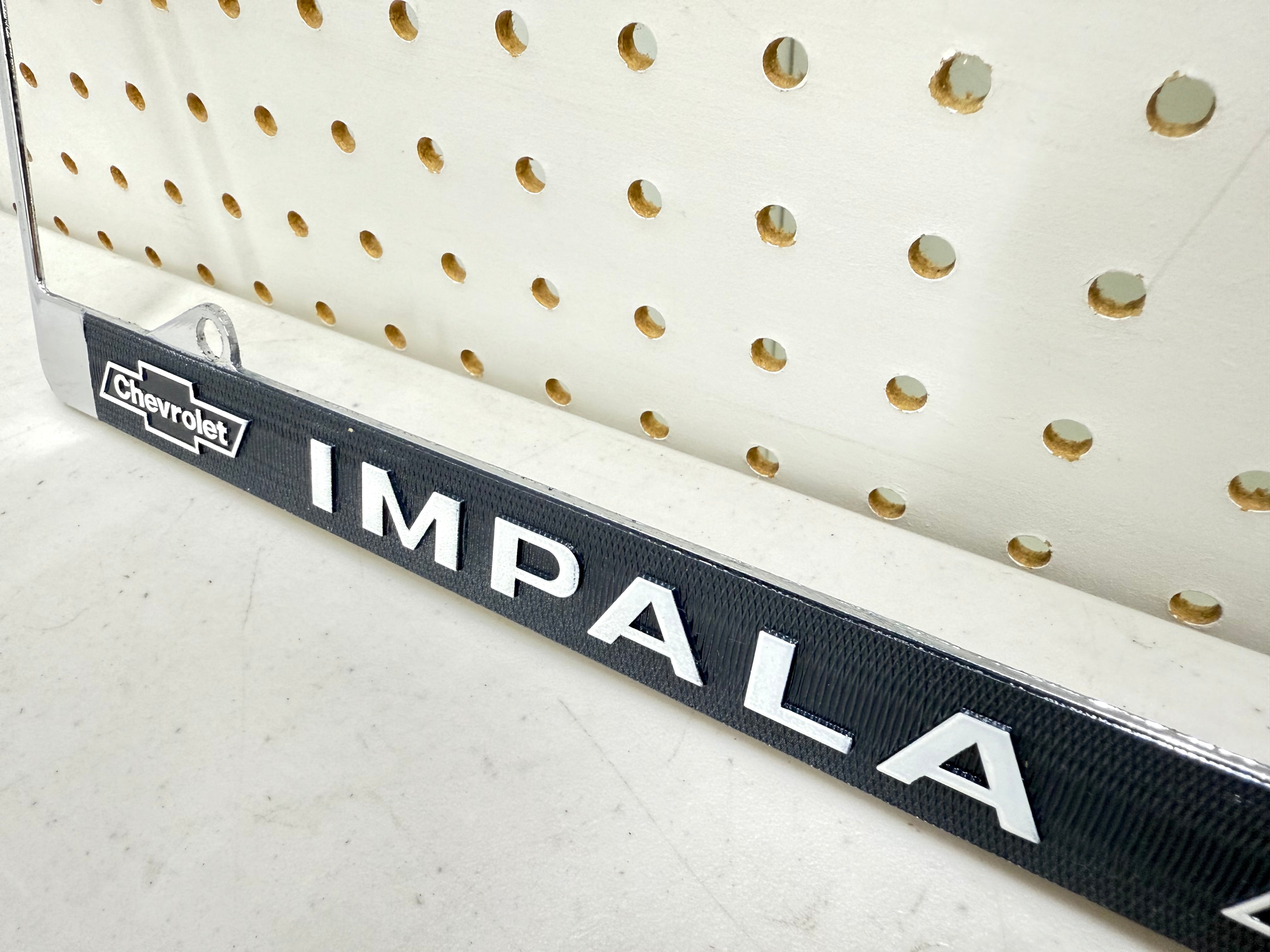 The license frame showcases Double chevy bowtie Logo and IMPALA letter is providing a distinctive and authentic vintage look. The chrome frame finish adds a sleek and polished appearance. It also adds to the visual appeal and quality as well.
