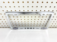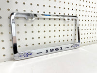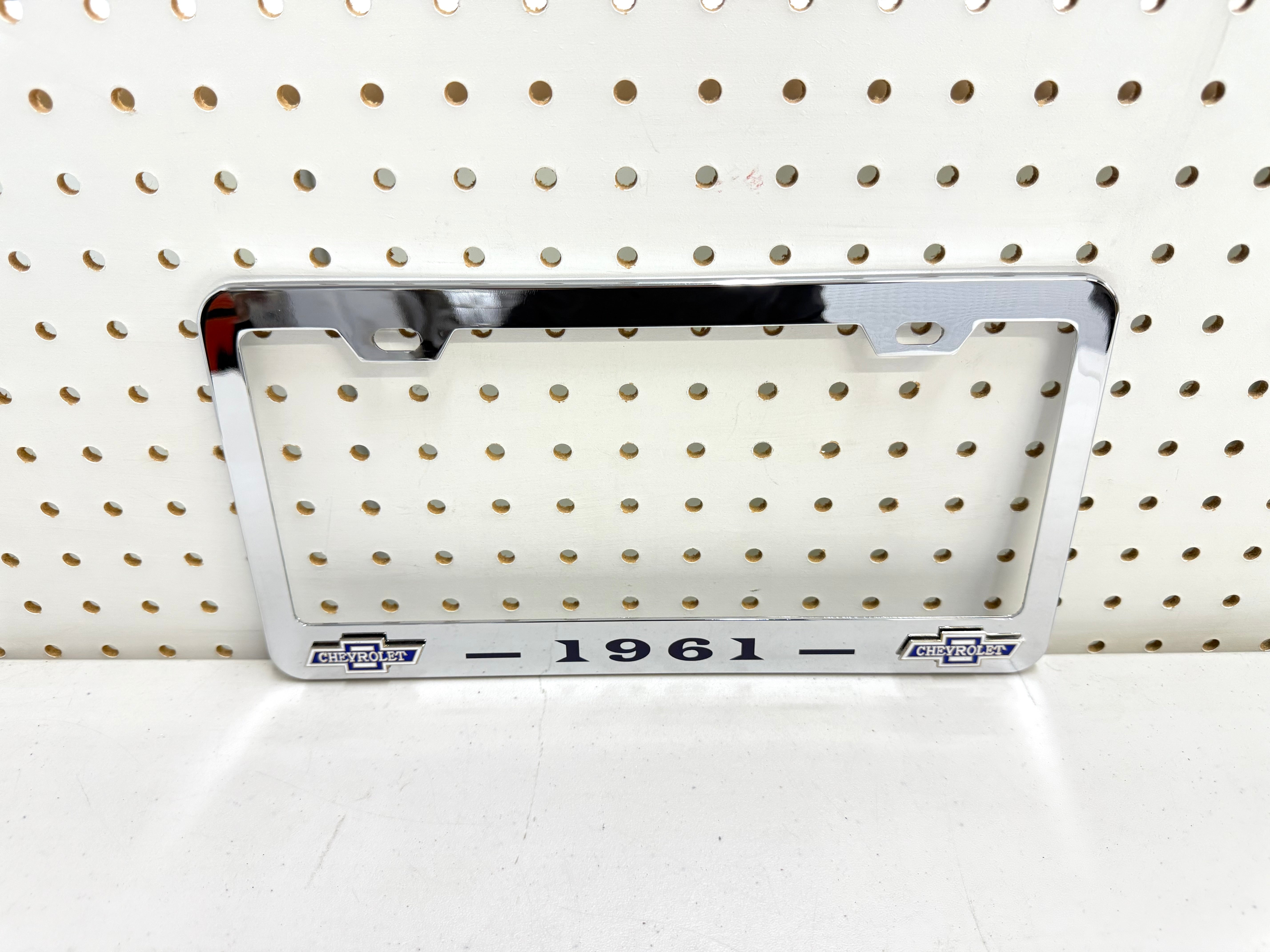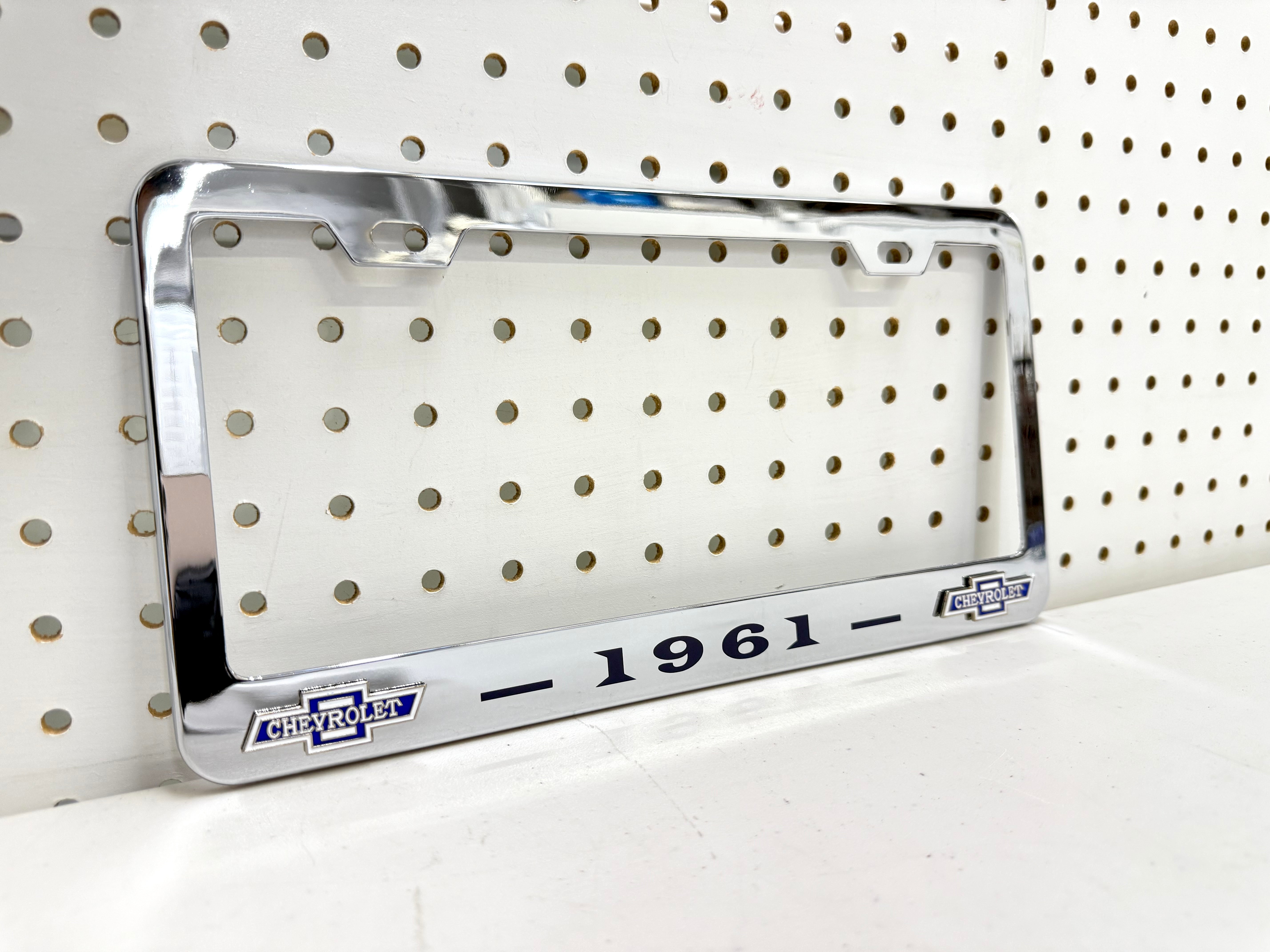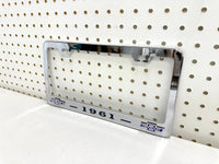 1961 CHEVROLET IMPALA, BEL AIR, BISCAYNE CHROME LICENSE PLATE FRAME WITH DUAL CHEVY BOWTIE LOGOS (2 HOLES)