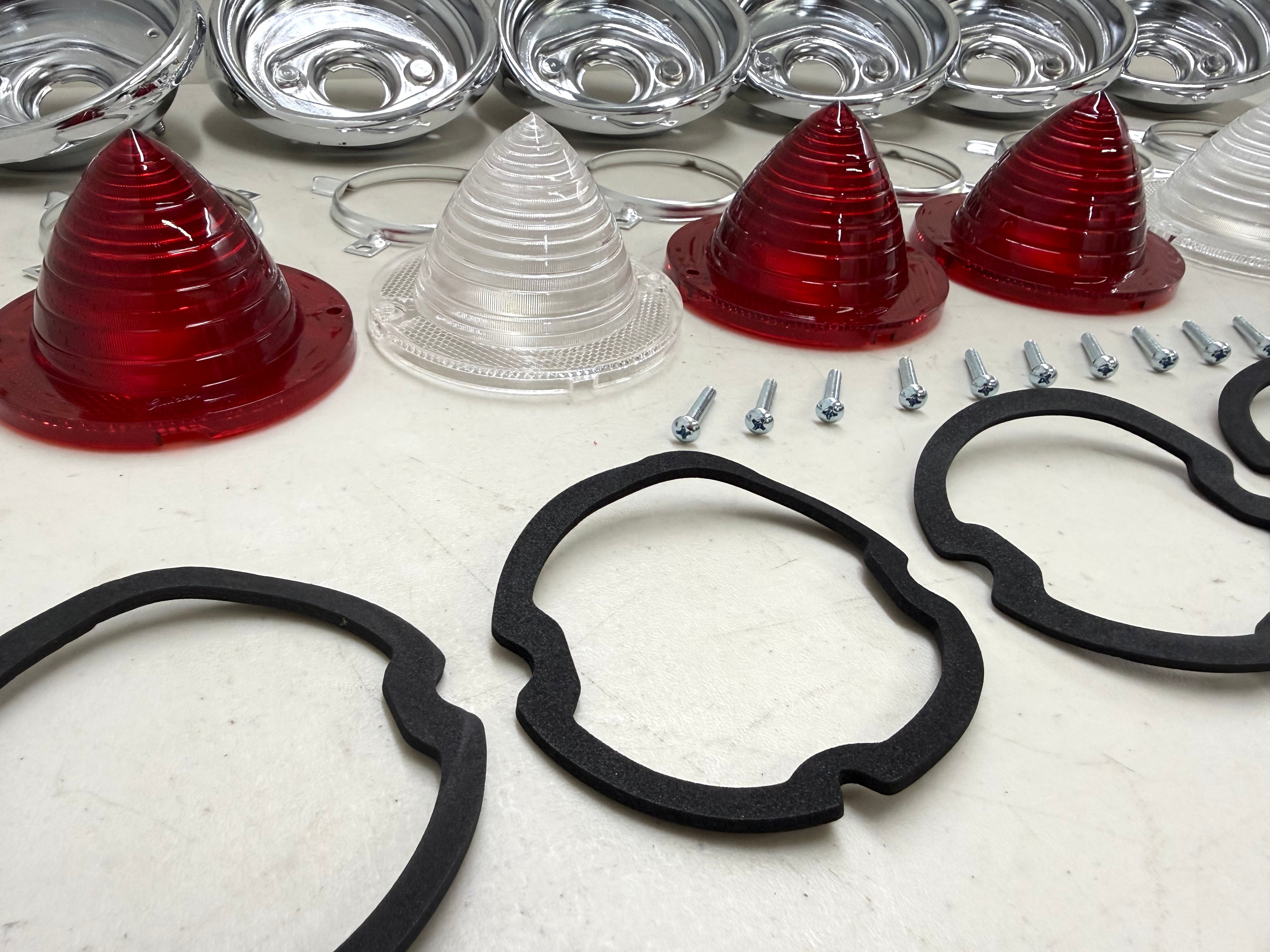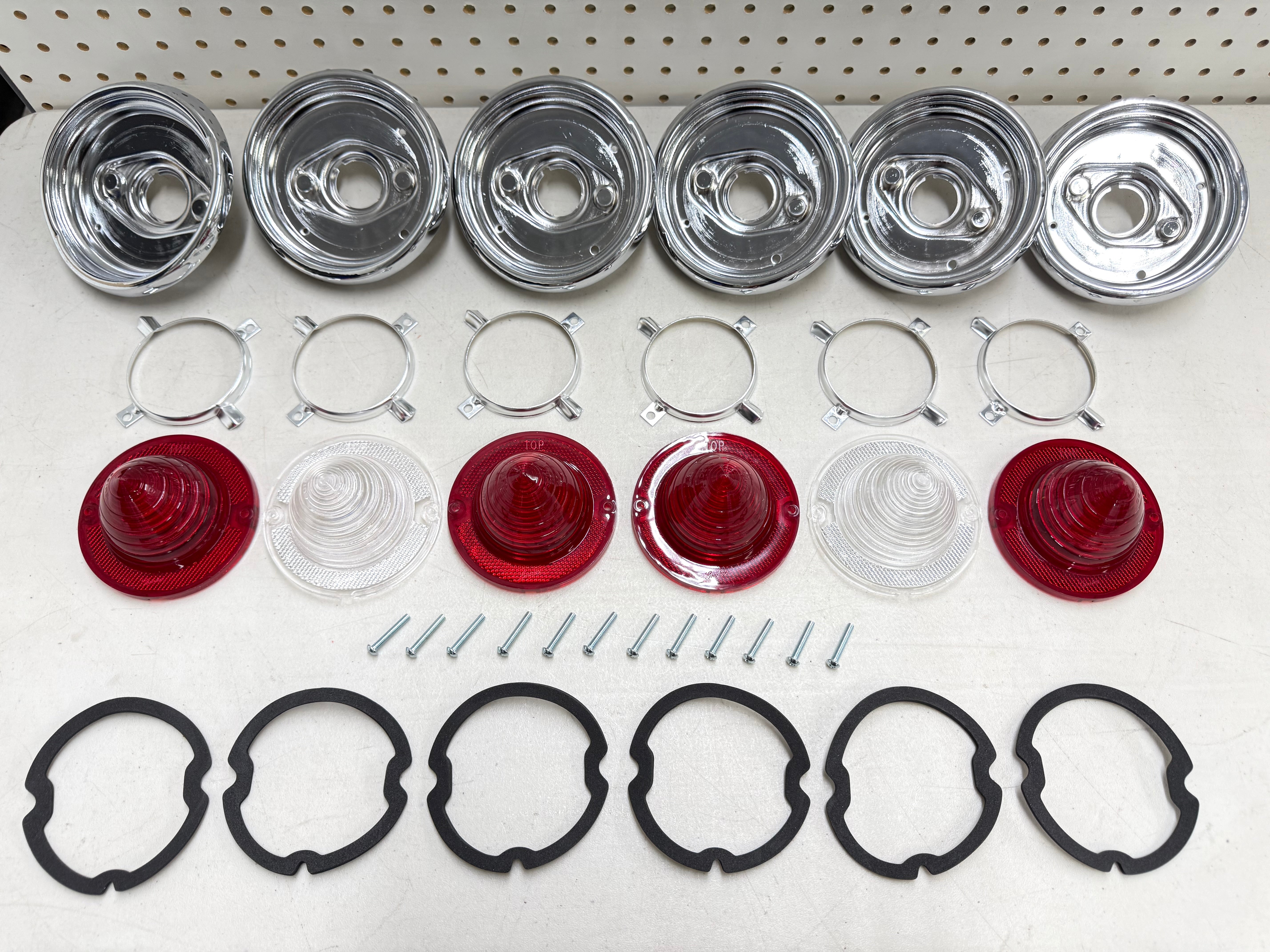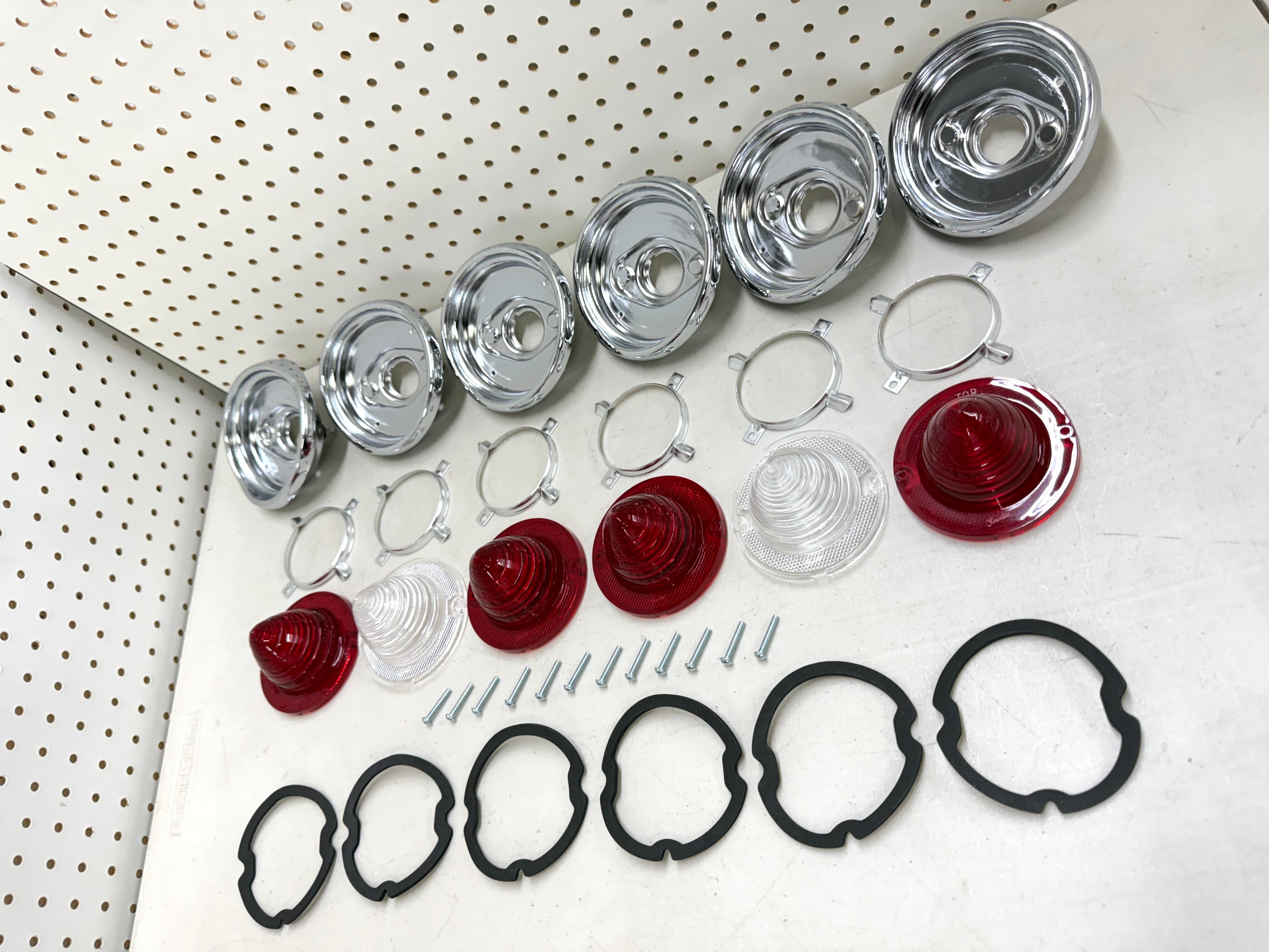 This is reproduction comprehensive tail lamp set for 1961 chevy impala models. Each set includes 4 tail lamp lenses, 2 back up lenses, 6 aluminum tail lamp bases (Tail Light Bezel , Tail Light Housing), 6 aluminum tail lamp trim rings, 1 set of tail lamp lens gaskets and 1 set of tail lamp screws. The tail lamp lenses feature the correct “Guide” markings for complete authenticity.