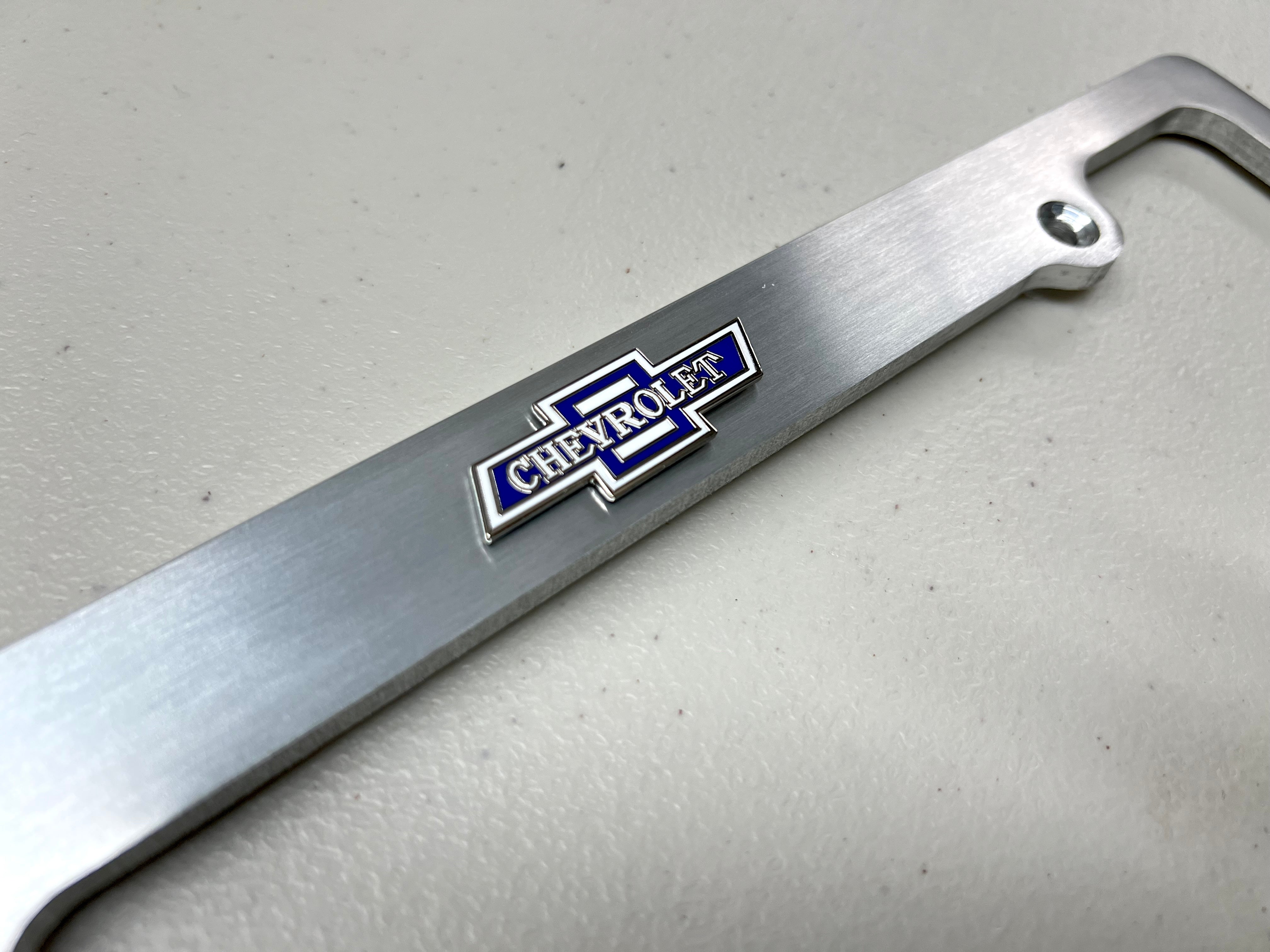The license frame showcases a 3D OEM Chevy bowtie Logo is providing a distinctive and authentic look. The brushed aluminum finish adds a sleek and polished appearance. It also adds to the visual appeal and quality as well.