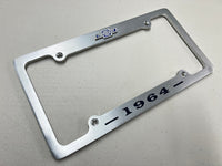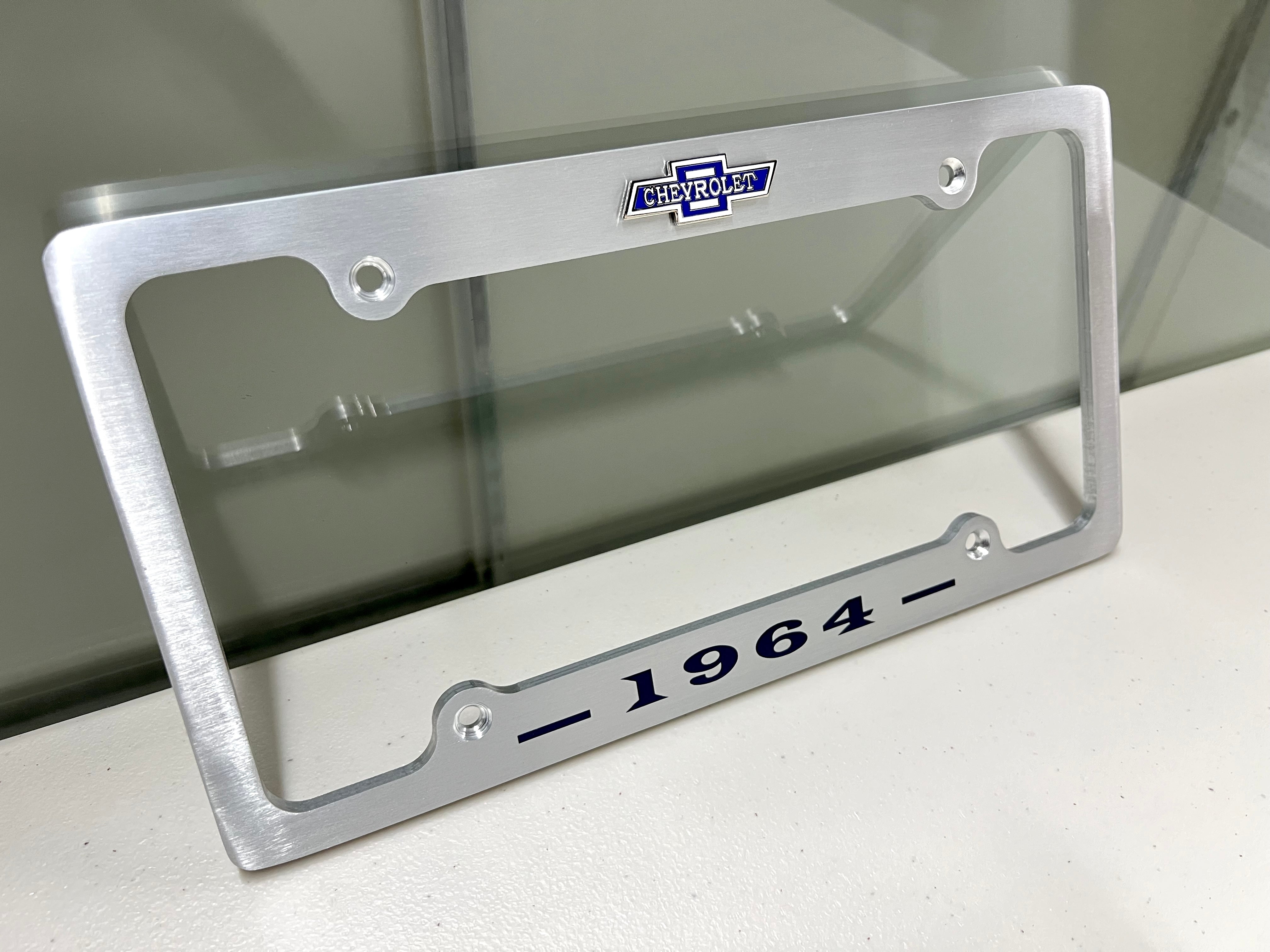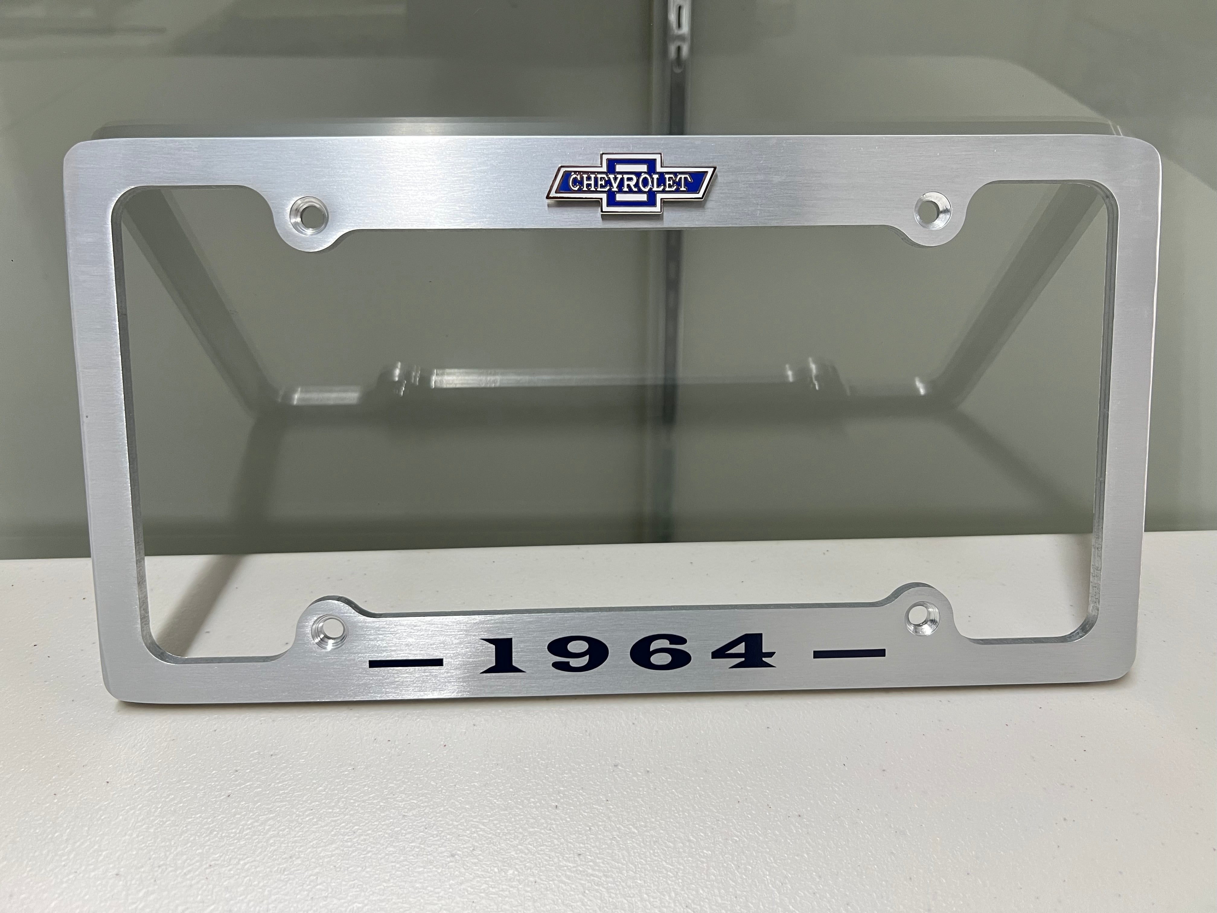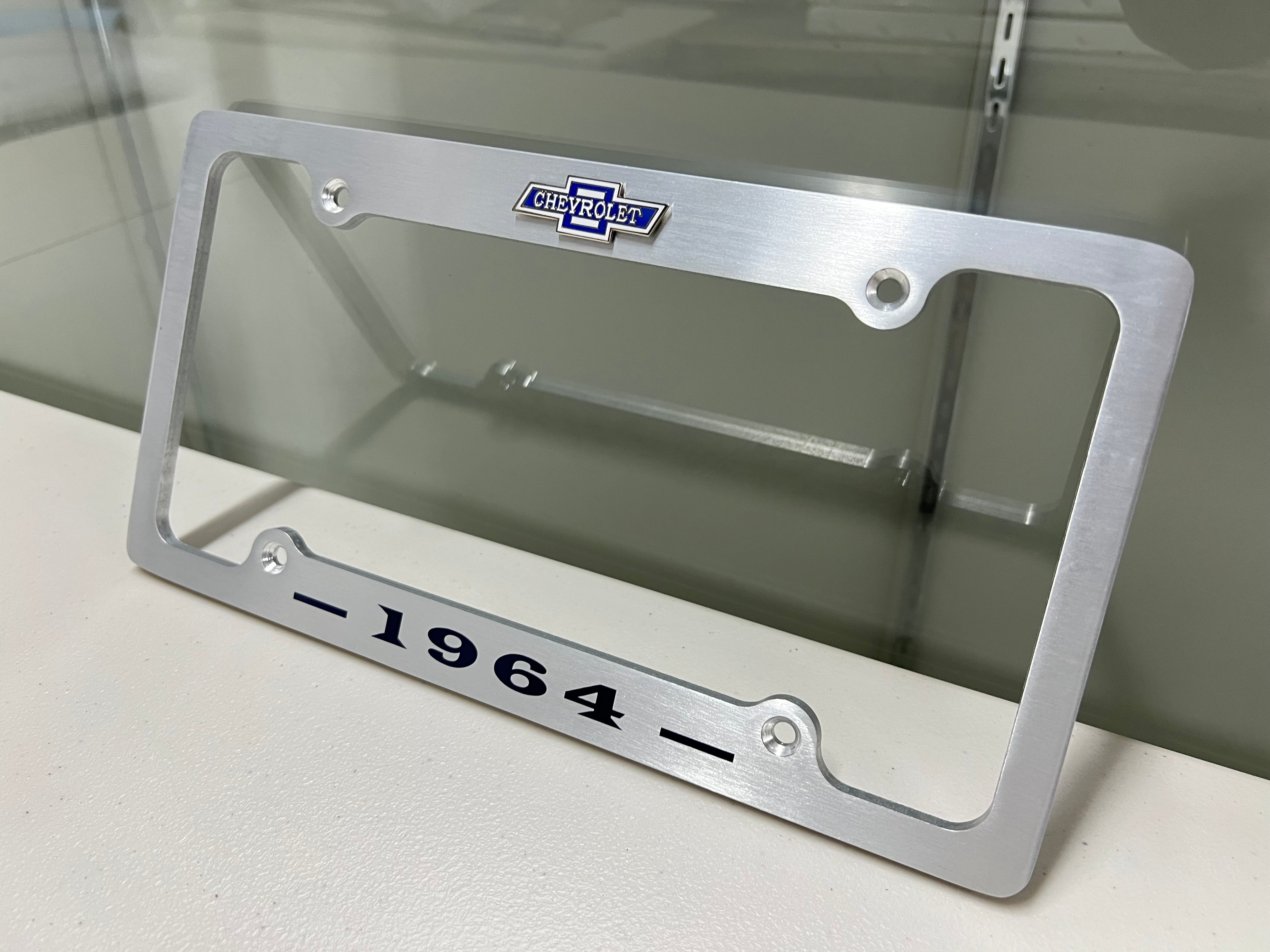 1964 CHEVROLET IMPALA, BEL AIR, BISCAYNE BRUSHED ALUMINUM LICENSE PLATE FRAME WITH BOWTIE LOGO