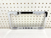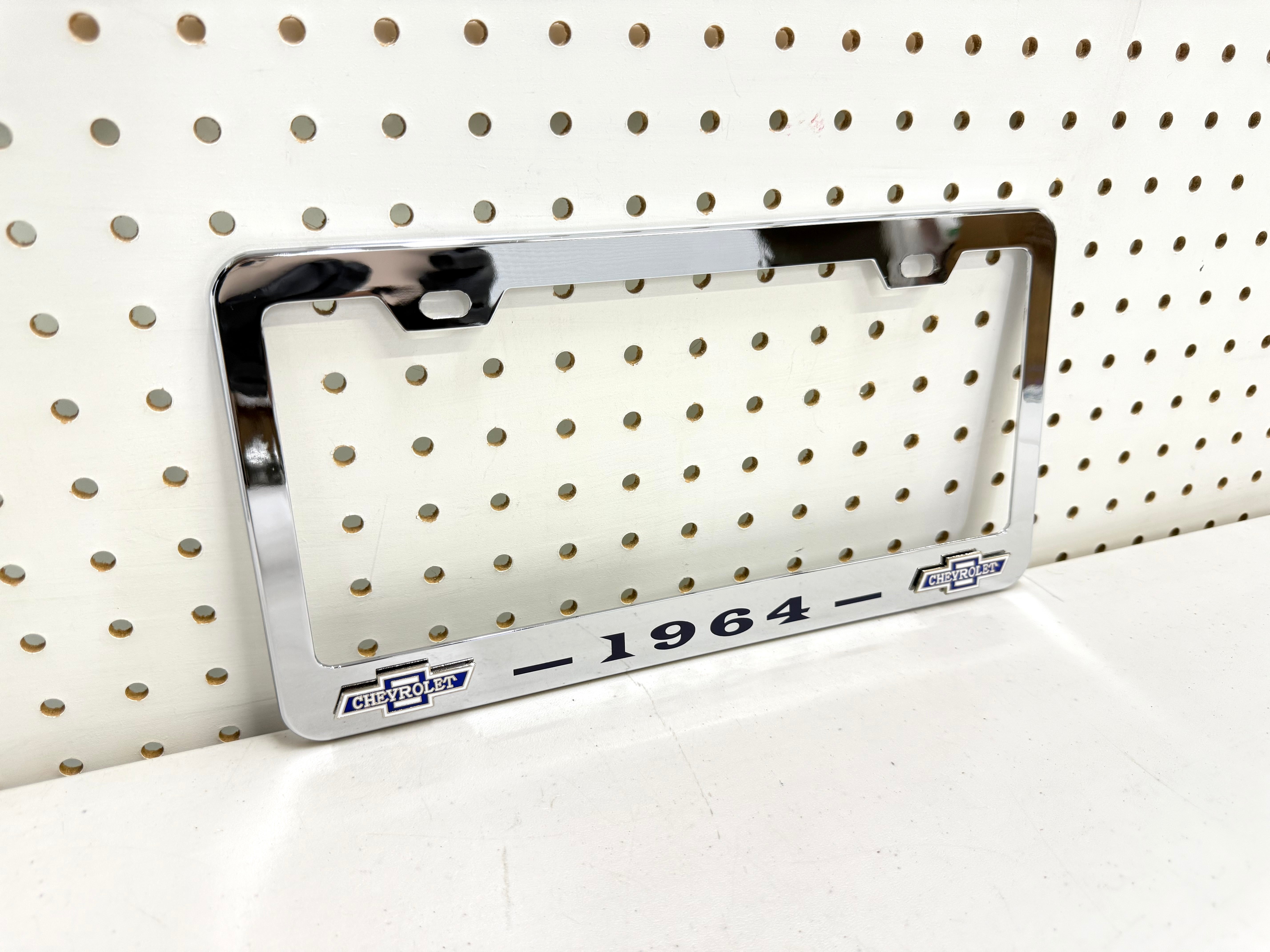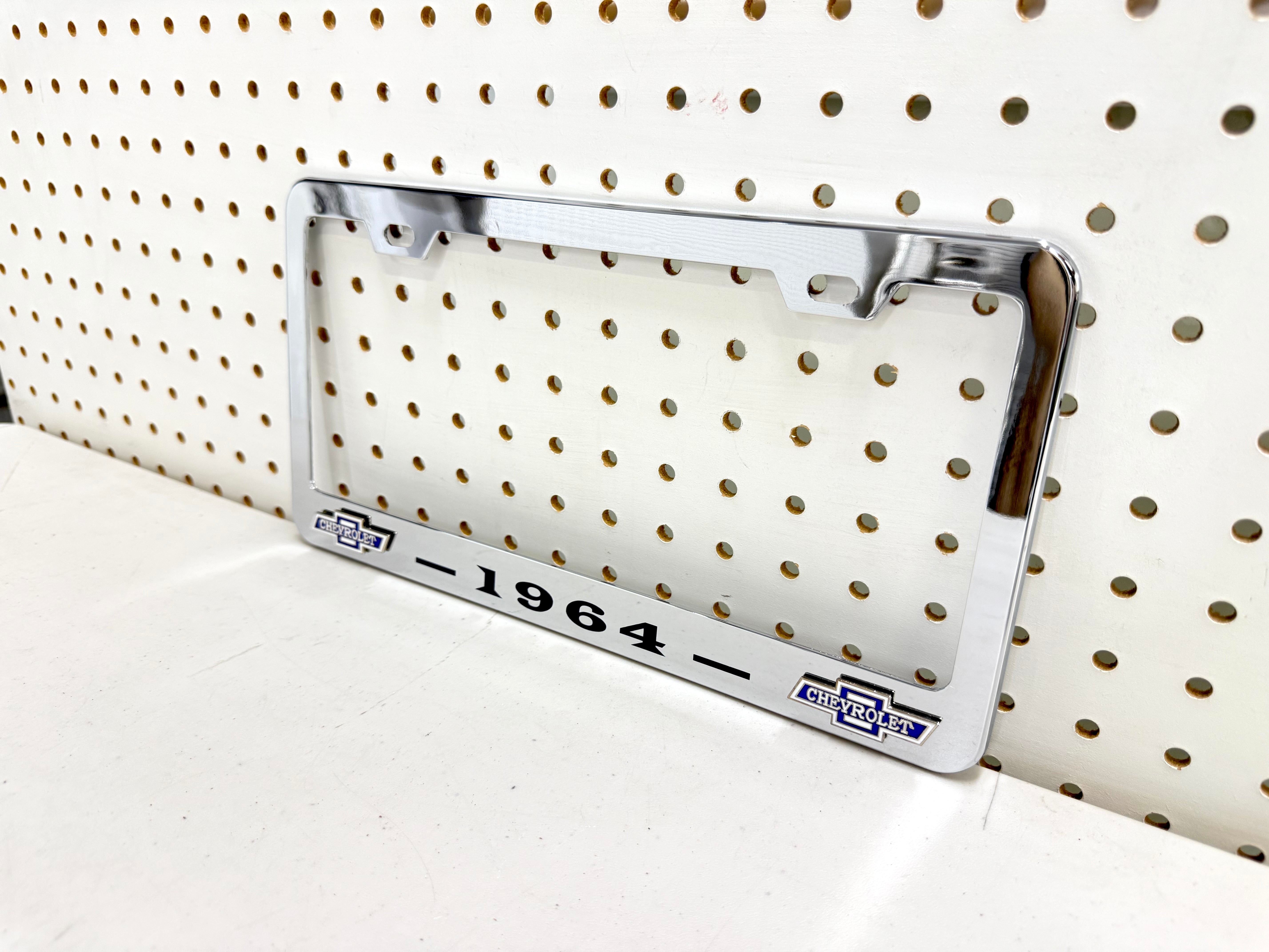 1964 CHEVROLET IMPALA, BEL AIR, BISCAYNE CHROME LICENSE PLATE FRAME WITH DUAL CHEVY BOWTIE LOGOS (2 HOLES)