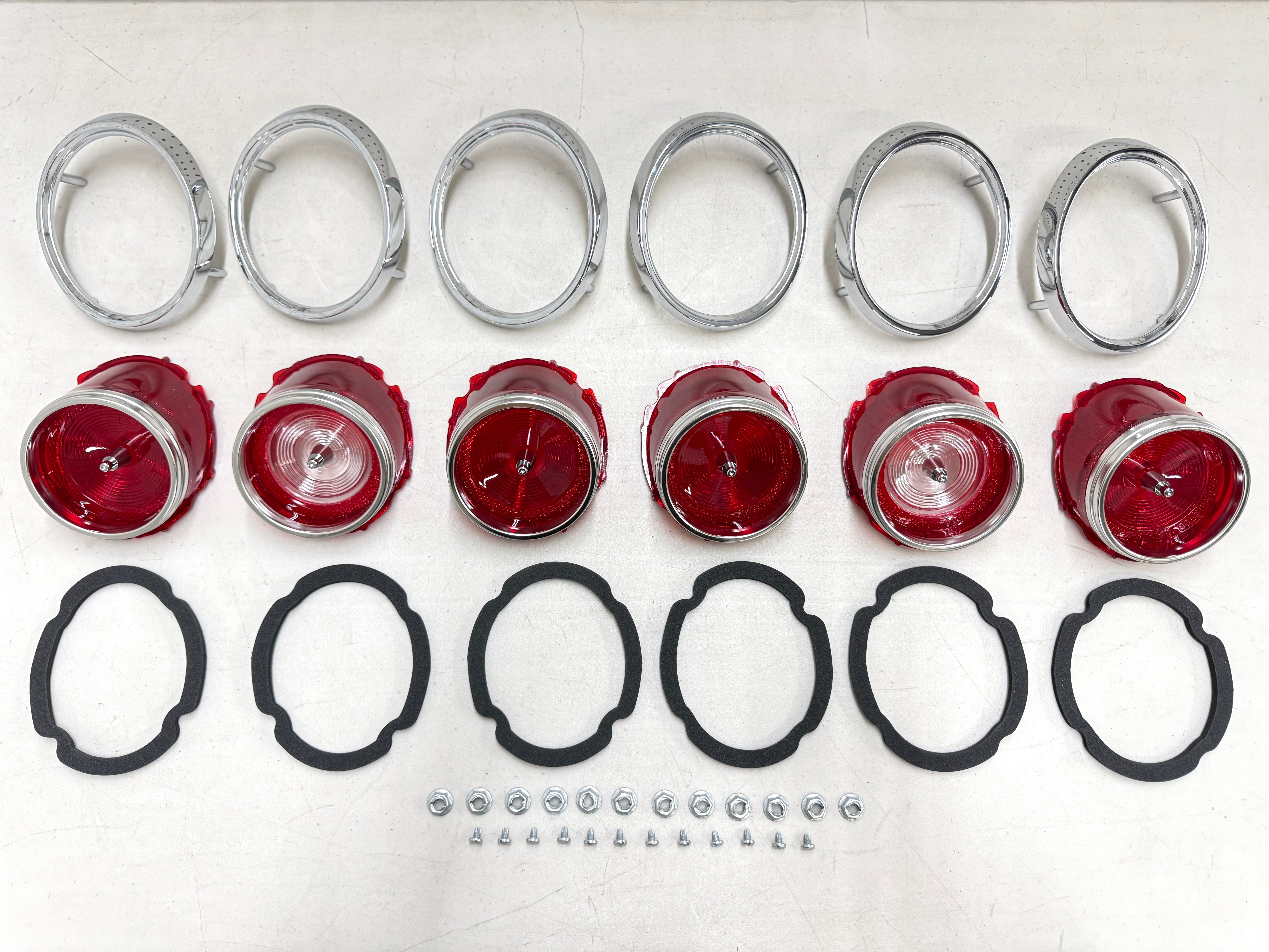 This is reproduction comprehensive tail lamp set for 1965 chevy impala models. Each set includes 4 tail lamp lenses, 2 back up lenses, 6 die-cast chrome tail lamp trim rings (Tail Light Bezels , Tail Light Housing), 1 set of tail lamp lens gaskets and 1 set of tail lamp screws. The tail lamp lenses feature the correct “Guide” markings for complete authenticity.