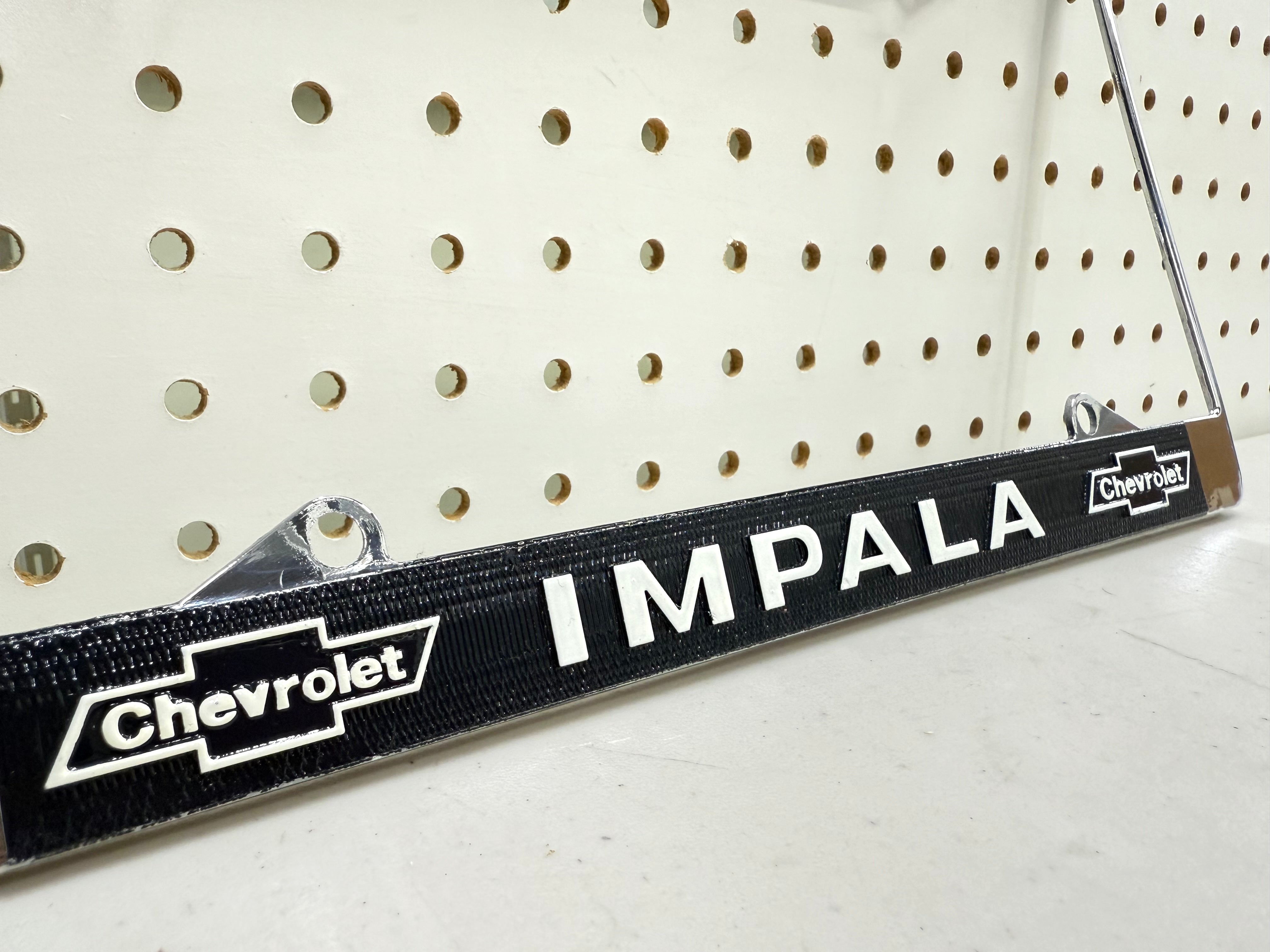 The license frame showcases Double chevy bowtie Logo and IMPALA letter is providing a distinctive and authentic vintage look. The chrome frame finish adds a sleek and polished appearance. It also adds to the visual appeal and quality as well.
