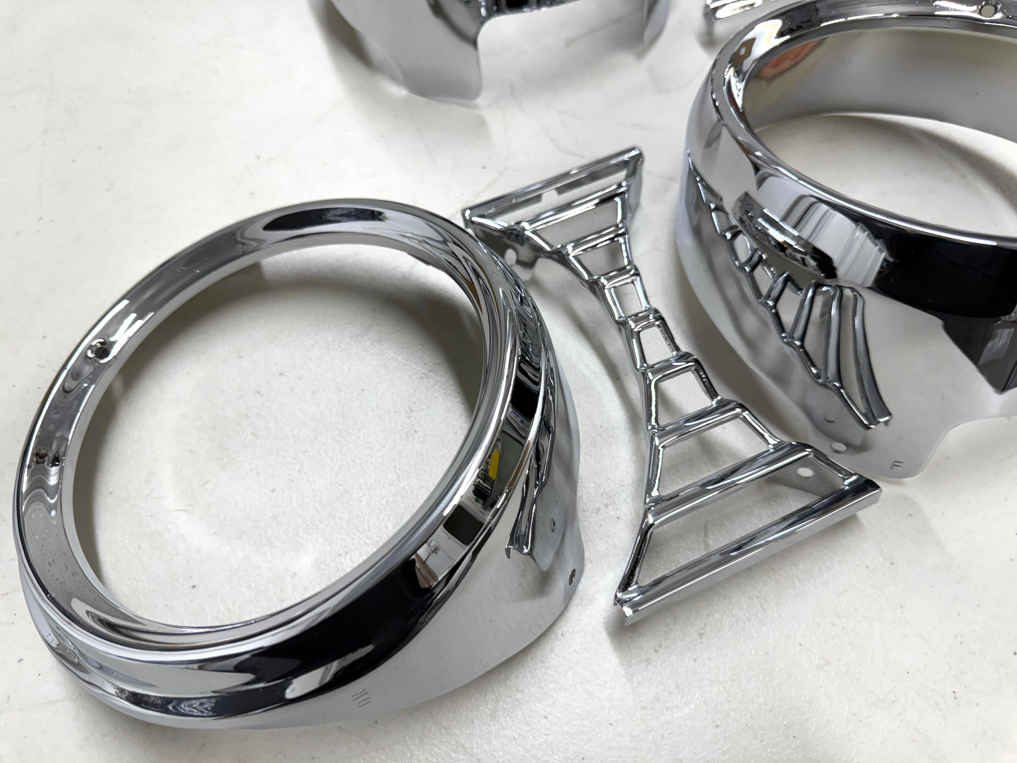 NOTE: Because these are original parts that have been chromed some bezels will have signs of pitting. These are NOT reproduced so this is the best that they come. All four bezels are different to accommodate the left and right inner and outer.